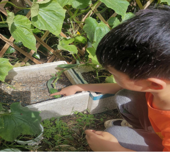 我们的种植园经过老师和小朋友们一起精心照顾,终于长出果实了,圆圆的小番茄从绿色变成橙色再变成红色,摘下一颗尝了尝,还是有点酸,不过有一股新鲜的味道。黄瓜也长的细细长长,身上带着尖尖的刺保护着自己。再去看看我们的辣椒、茄子都已经全部长出来了,还有两天就可以摘下来吃了呢。我们的太阳花也微微露出他那金黄的笑脸了呢。